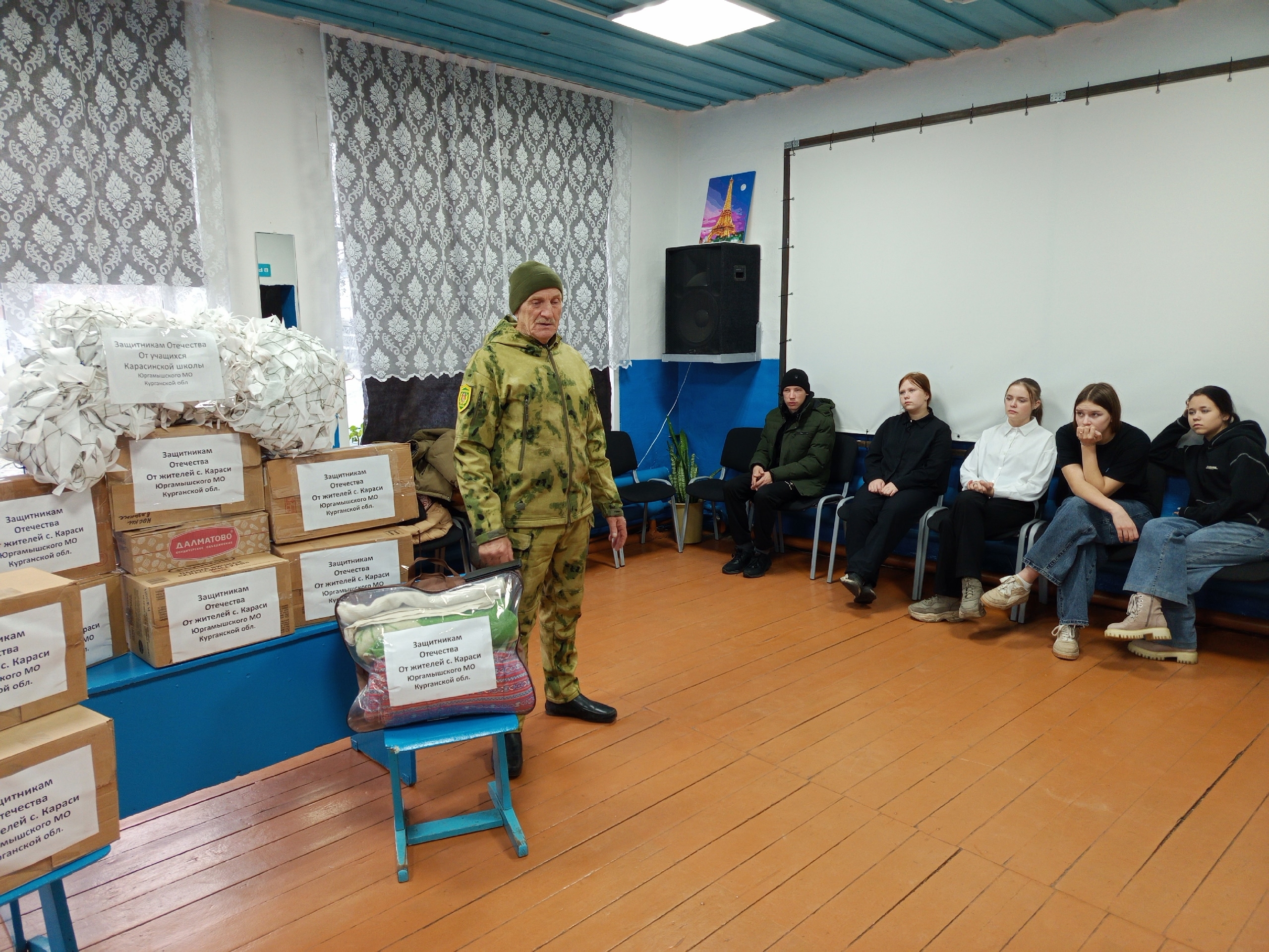 12 ноября в Карасинском доме культуры прошла встреча учащихся Карасинской СОШ с почётным гражданином Юргамышского МО, общественным деятелем, волонтёром СВО Уруповым Михаилом Михайловичем.